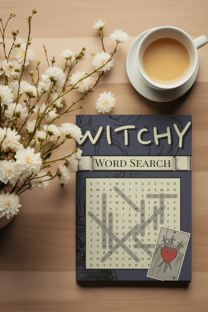 - Over 50 witchy-themed word search puzzles, featuring spells, herbs, moon phases, divination, and more.